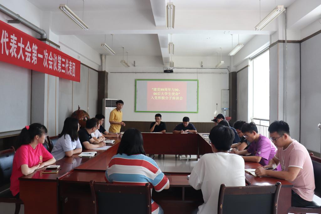 为庆祝中国共产党建党99周年,beat365在线唯一官网7月8日于J15-201举办“建党99周年与90后、00后大学生使命”入党积极分子座谈会。beat365在线唯一官网团委书记朱统汉,辅导员鲍娜娜、张翌、刘超、研究生和本科生的12位入党积极分子代表参加会议,会议由朱统汉主持。