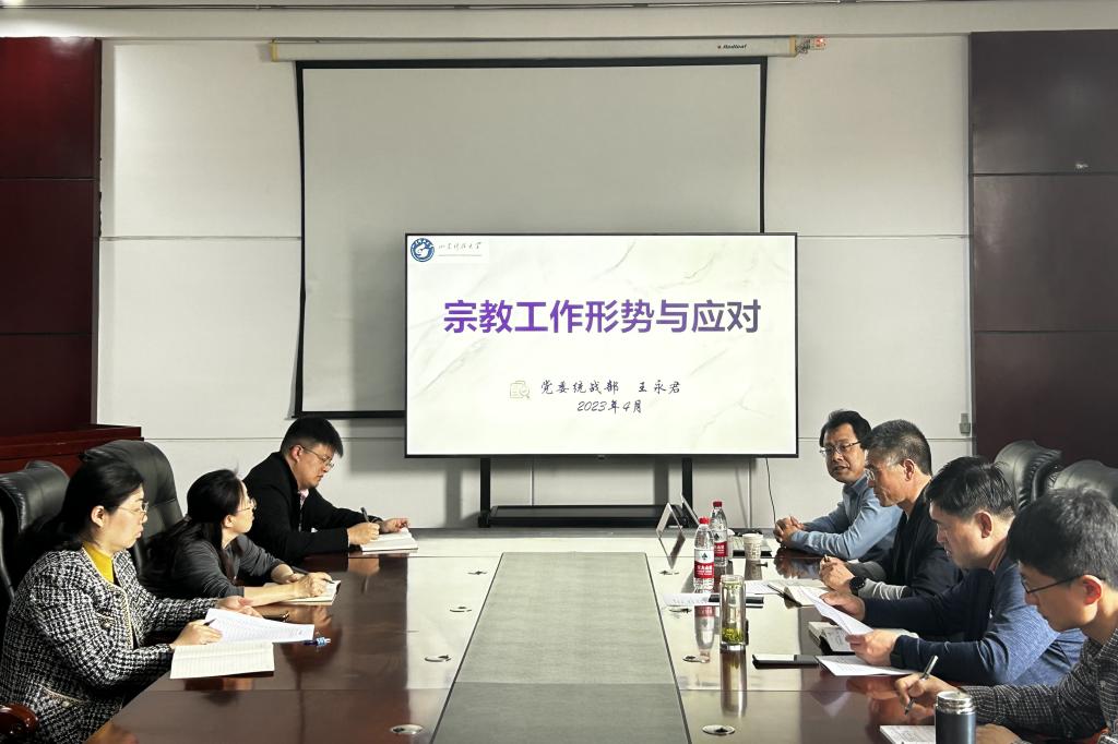 4月18日,beat365在线唯一官网党委理论学习中心组(扩大)开展2023年第六次集体学习,学校党委统战部常务副部长、台港澳工作办公室主任王永君应邀作《宗教工作形势与应对》专题报告。会议由学院党委书记宋西路主持。学院党委理论学习中心组、全体党支部书记、教工党支部支委委员、系所中心主任、科室负责人参加了会议。