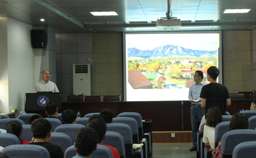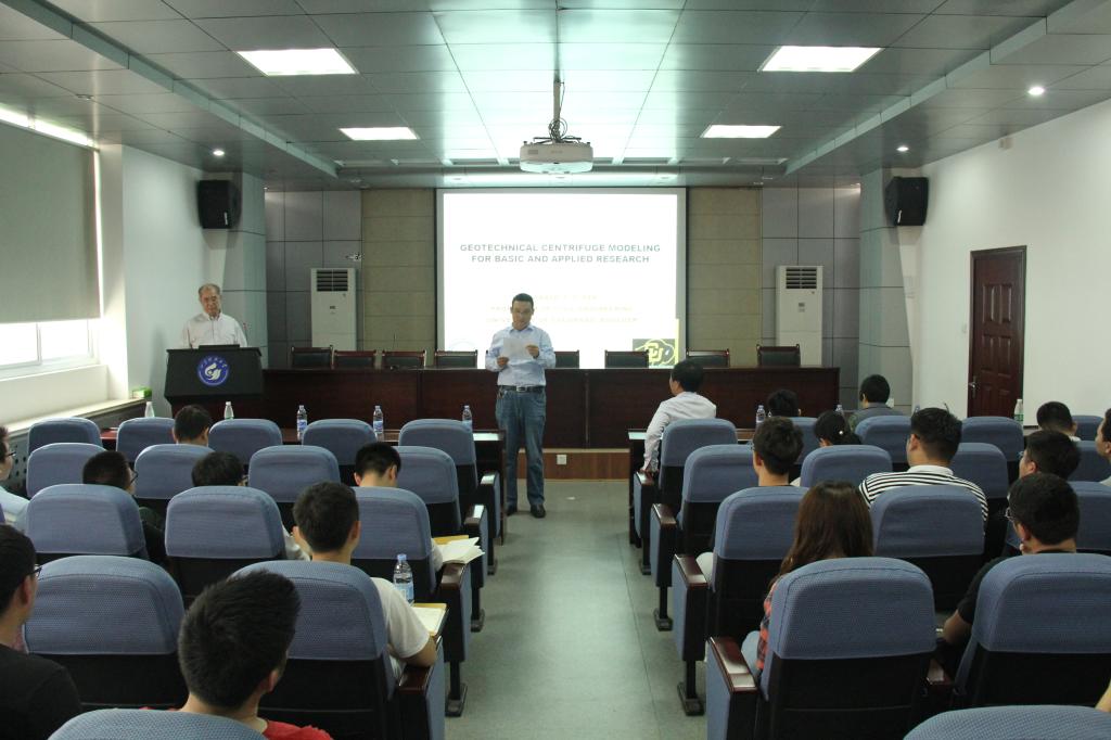 首先,张宪堂向大家介绍了Ronald Pak。随后,Ronald Rark围绕岩土工程离心方法的物理模型、实验仪器、模拟实验、参数研究与模型确认四个方面展开论述。为让在场的同学对所述内容有更加直观地感受,他列举了动力作用对土结构的影响以及埋土爆破的离心机试验问题两个实例并作出解释说明。最后,在提问环节,在场师生先后提出了关于岩土工程发展前景、有关模型假设和数据处理等方面的问题,Ronald Park耐心详细的解答,实现了师生间的良好互动。