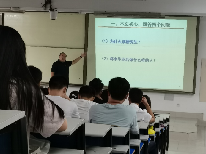 首先,张雨坤向同学们提出了两个问题:为什么读研究生?将来毕业后做什么样的人?同时,张雨坤引导新生思考这两个问题,只有不忘初心,才能方得始终。接着,他向同学们介绍了研究生与本科生的区别,包括学习方式、学习资料、学习成果、师生关系的不同,引领同学们接受新角色的转变,加快适应脚步,更好地迎接研究生生活。随后,张雨坤向大家介绍了优秀研究生所应具备的素质:牢固的基础知识、扎实的语言功底、成熟的科研素质、严谨的学术道德以及文明的精神、健壮的体魄,鼓励同学们按优秀研究生的标准严格要求自己。最后,张雨坤鼓励新生积极迎接新的挑战,通过加强基础知识、语言的学习,培养科研思维,最终做到知行一致。
