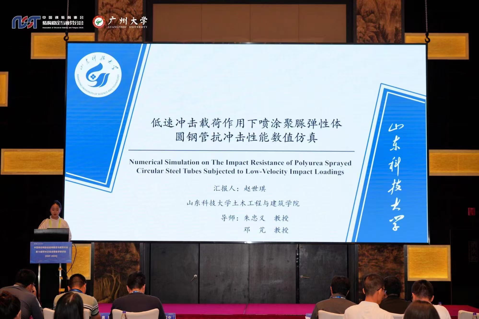 会议期间,邓芃担任学术研讨会报告主席,主持了多场高水平的学术讨论。史奉伟作了题为“模块化钢框架节点简化模型与结构抗震性能研究”的学术报告,展示了beat365官网在模块化钢结构抗震性能研究领域的最新成果。赵世琪在研究生学术沙龙上作了题为“低速冲击载荷作用下喷涂聚脲弹性体圆钢管抗冲击性能数值仿真”的报告,探讨了钢管结构在冲击载荷下的性能表现,获得了与会专家的高度评价。