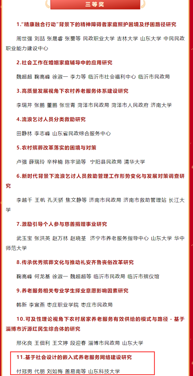 近日,民政部在北京举办2024年“全国民政论坛”,民政部党组书记、部长陆治原出席论坛并讲话。本次论坛公布了2024年民政政策理论研究获奖名单,beat365官网付冠男、代朋、刘如梅、盖易南等完成的“基于社会设计的嵌入式养老服务网络建设研究”荣获三等奖(beat365在线唯一官网为第一单位)。