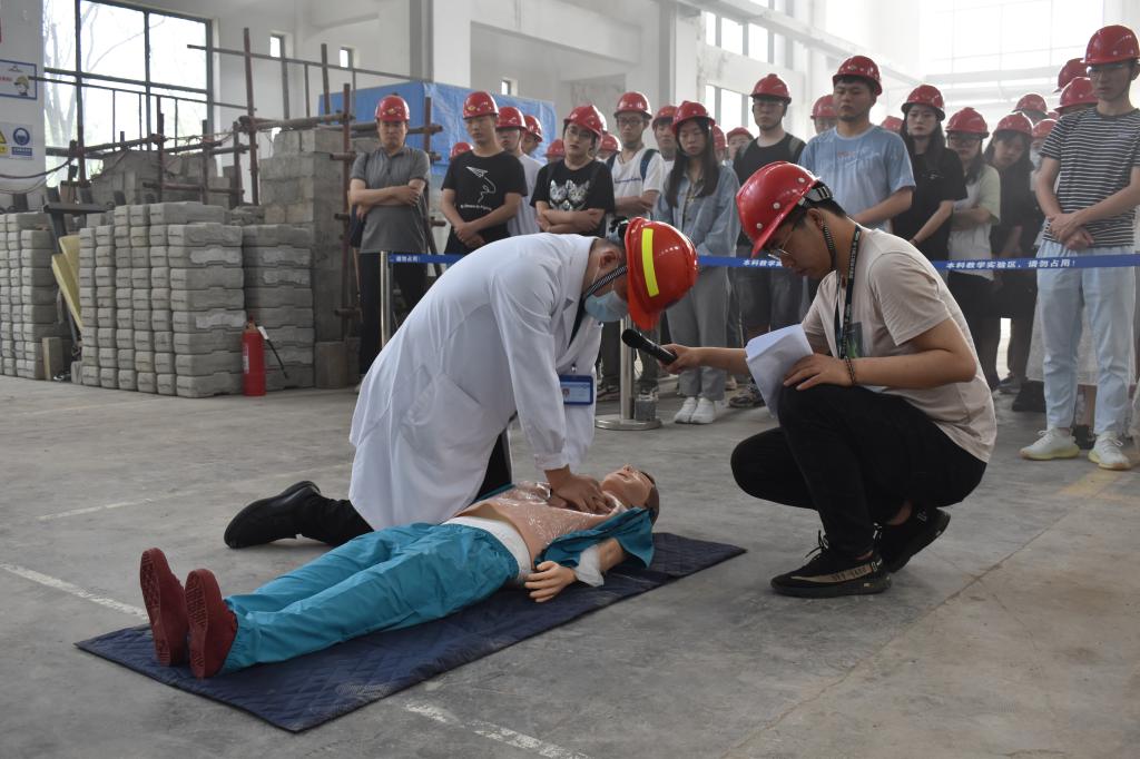 演练现场,校医院副院长李辉为师生介绍并演示了对伤员的抢救步骤,安全管理处消防人员演示了灭火器的使用步骤并指导部分同学进行实操学习。