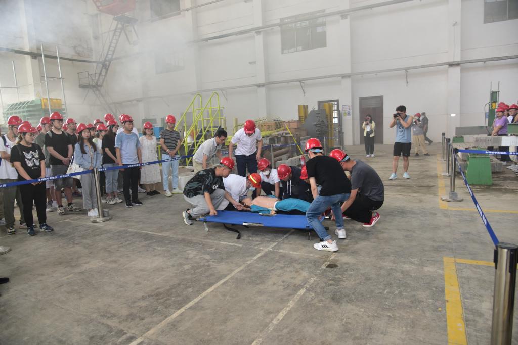 张英杰副校长宣布演练开始。安全应急演练模拟了结构大厅实验室在使用过程中发生高处坠物的场景,坠物砸断设备接线后砸伤一名同学,断开电线与伤员身体接触导致昏迷,同时断裂的线路短路起火。演练分为事故发生、事故确认与报告、启动应急响应与先期救援、伤员转移与急救、人员撤离等部分,各环节衔接紧密、协调有度,演练人员反应迅速、行动果断,为现场观摩人员上了生动一课。