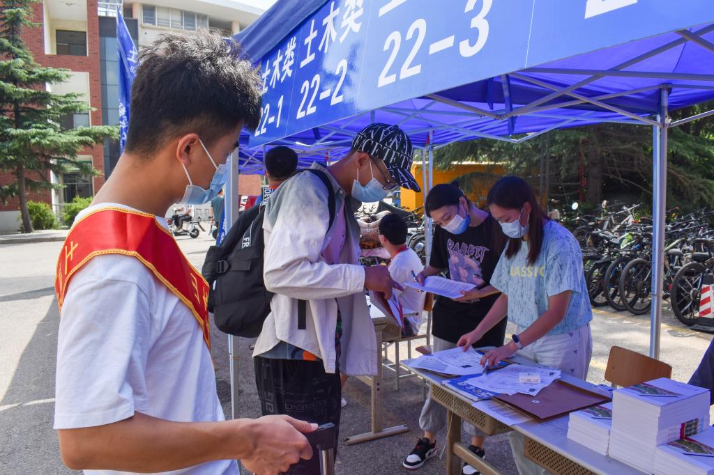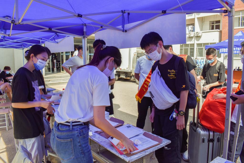亮码、测温、出示相关证件,新生随后搭乘摆渡车去往报道点。热情的学长学姐等不及摆渡车停稳就招呼着,询问专业和班级、帮忙搬行李、带领前往迎新岗,审核完证件就可以领钥匙进宿舍啦!beat365在线唯一官网出动百余名志愿者服务于南门、北门、尤洛卡广场以及宿舍楼等多个站点,为新生及时提供咨询问路、行李搬运等贴心服务。