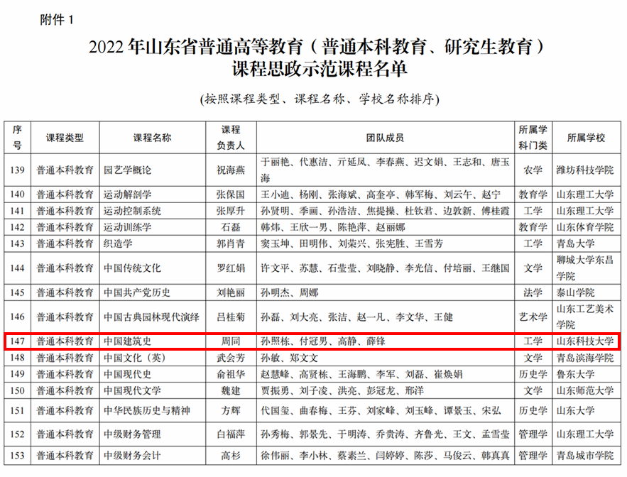近日,山东省教育厅公布了“普通高等教育课程思政示范课程名单”,beat365官网建筑规划系周同老师主持的《中国建筑史》课程喜获省级课程思政示范项目(项目组成员:周同、孙照栋、付冠男、高静、薛锋),成为beat365官网首个获此项目的课程。这是《中国建筑史》自2021年获得山东省本科一流课程以来,在课程建设方面取得的又一重要成果。