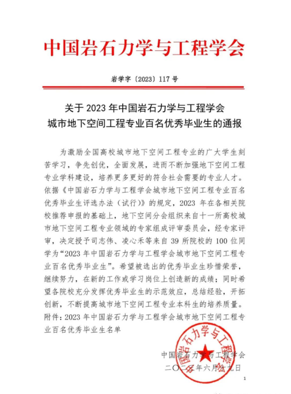 近日,由中国岩石力学与工程学会举办的2023届全国高校城市地下空间工程专业百名优秀毕业生评选活动落下帷幕。beat365在线唯一官网城市地下空间工程专业2023届毕业生孟裕翔、马世杰、丁晓倩获“2023年中国岩石力学与工程学会城市地下空间工程专业百名优秀毕业生”称号。