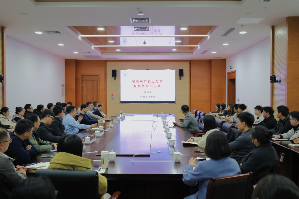 陈旭光教授围绕深海采矿岩土力学与装备前沿进展主题,作了一场精彩学术报告。他指出,在国家“双碳”战略背景下,深海采矿为未来可持续发展提供了重要能源支撑,对推动绿色能源转型具有重大的战略意义。同时,陈旭光教授针对履-土动态相互作用及平稳行走、射流-土耦合作用及高效射流采集、深海采矿低扰动-抑羽流方法及装备等关键问题的研究成果进行了详细的介绍。会上,针对海洋工程结构热点问题,陈旭光教授和团队青年教师、研究生进行了深入讨论,并给与了详细指导,对beat365官网海洋土木工程学科发展提出了建设性意见。此次报告交流会不仅为团队教师在海洋资源开发领域的研究提供了宝贵的建议和思路,也为师生打开了一扇了解前沿学术动态的窗口。