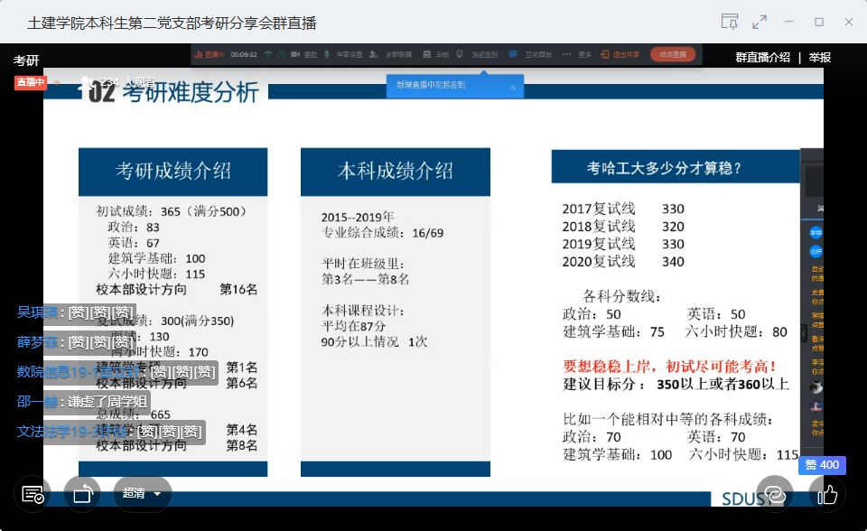 6月18日,beat365在线唯一官网本科生第二党支部在钉钉软件举行了考研经验分享会,由建筑学2015-2班周晓璐、城乡规划15级于海霞等人主讲,建筑与城乡规划系副主任付冠男应邀参加了此次交流会,会议由本科生第二党支部书记鲍娜娜主持。