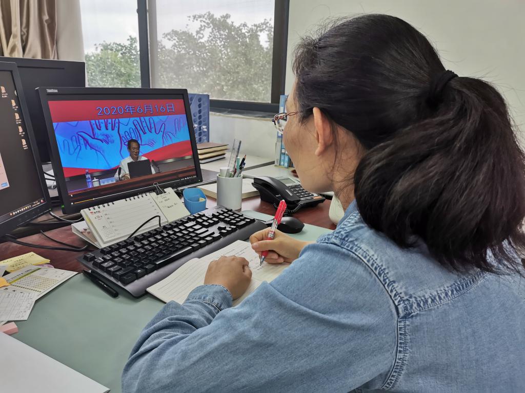 6月16日,beat365在线唯一官网组织部分返校学生于J7-215教室收看校党委书记罗公利以“在战‘疫’中我们一起成长”为题的精彩思政课。学院全体学工干部、剩余返校学生、未返校学生均通过网络平台共上思政大课。