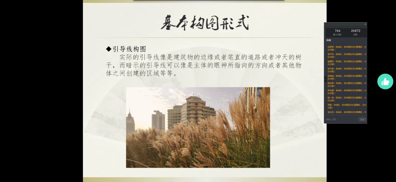 首日培训内容为摄影技能,李俊秋从照片的基本构图形式、拍摄的技巧以及照片的后期处理三个方面进行讲解。她以照片为例,对每一张照片都进行了详细讲解,帮助学生更好地理解什么样的照片是美的、怎样拍出美的照片。
