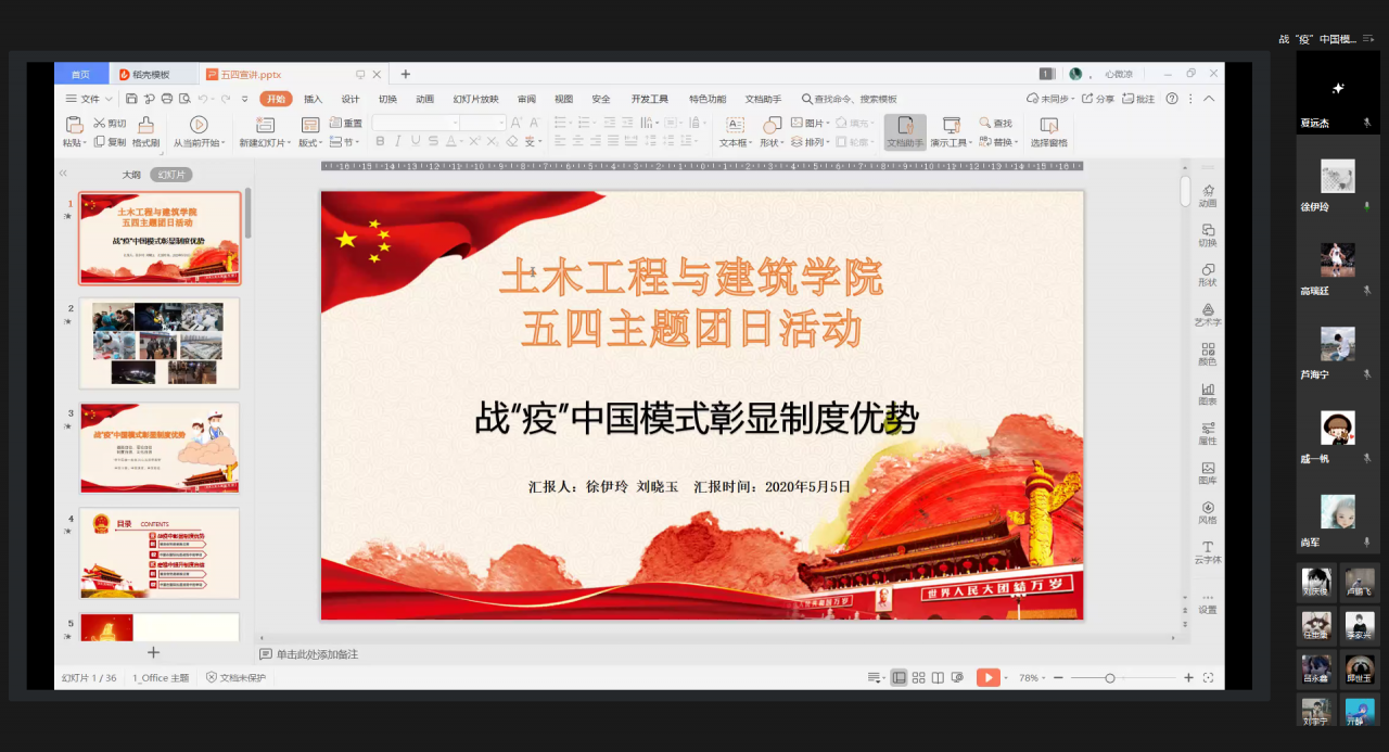 绽放战疫青春,坚定制度自信。此次团课让大家深入了解中国制度在战“疫”中的优势,团课中讲述的一批批逆行者也让大家热血沸腾。相信通过聆听今天的团课,土建学子一定会以在抗击疫情中涌现的勇士为榜样,用实际行动书写青年一代的家国情怀与硬核担当。
