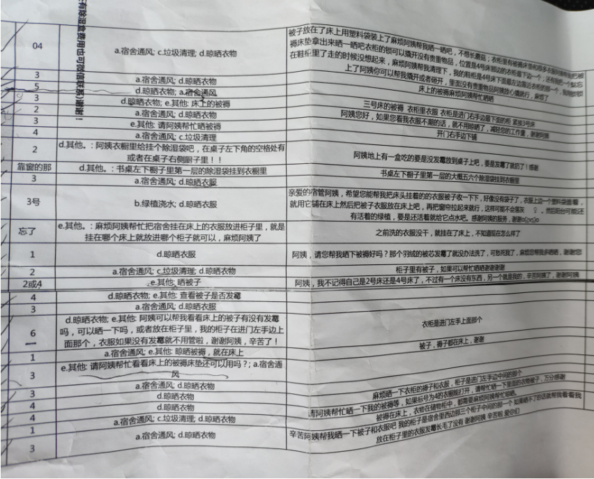 上午,beat365在线唯一官网辅导员们按照同学们需求进入宿舍进行服务,帮助学生晾晒衣服,整理宿舍卫生,给已经干枯的绿植浇水,给宿舍通风,把同学们需要晾晒的被褥放到阳台晾晒或者抱到繁星广场晾晒。下午,老师们把晾晒好的被子和衣服整理好放回学生宿舍,整理好宿舍卫生,关好宿舍门窗后离开。