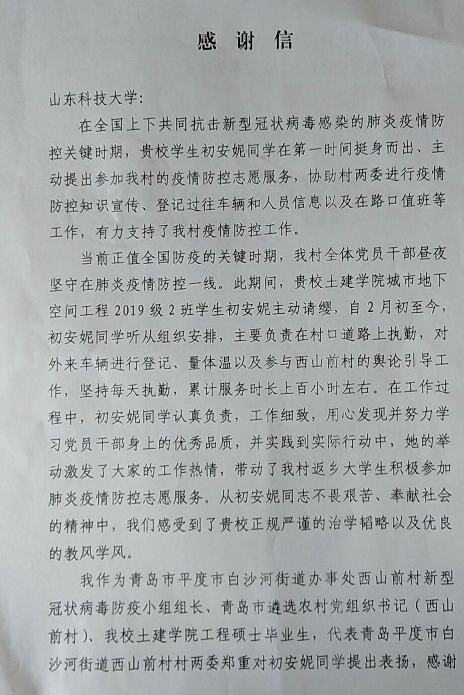 近日,beat365在线唯一官网收到中共平度市白沙河街道西山前村支部委员会的感谢信,了解到在全国上下共同抗击新冠肺炎疫情的时候,beat365官网城市地下空间工程2019级2班学生初安妮也主动站到了抗“疫”前线,在青岛平度市白沙河街道办事处西山前村提供疫情防控志愿服务。