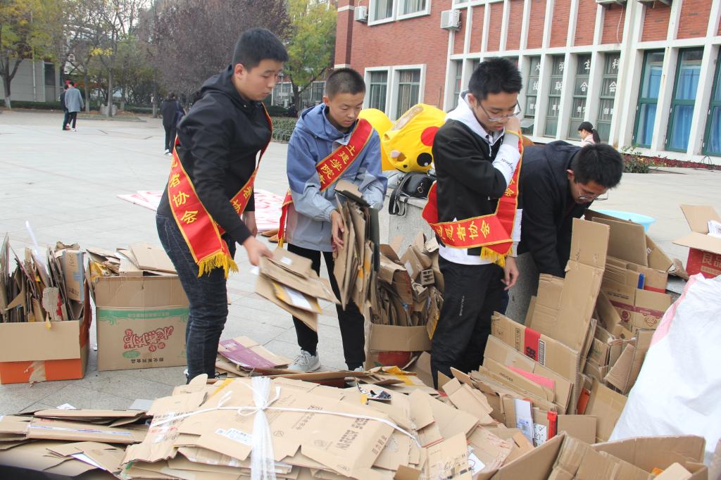 适逢双十一购物节,同学们积攒了较多的快递盒,学院的志愿者们便每晚马不停蹄地拜访各个宿舍,询问并收集瓶子、纸板等废品,并将它们分类打包。同学们更是积极配合,纷纷贡献出那份属于自己的爱心。在完成收集工作后,11月16日中午,志愿者们废品整理好,运往繁星广场进行总分类入袋。看着自己的收获成果,志愿者们露出满足的笑容。