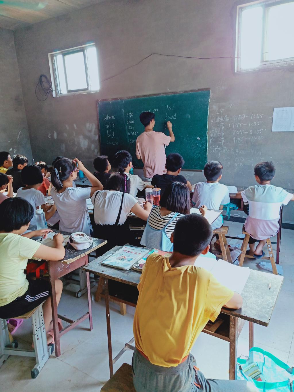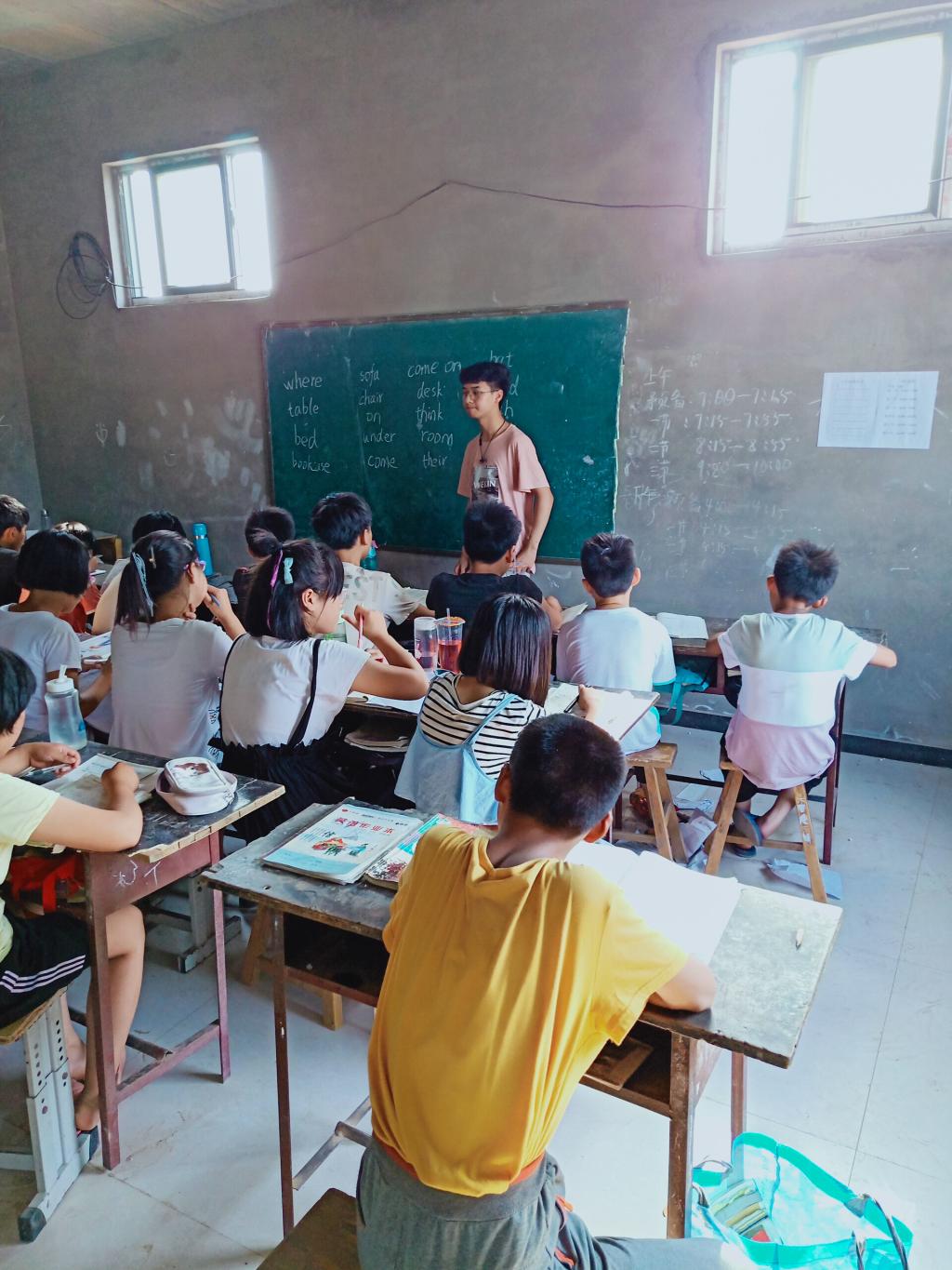 初到当地,队员们便马不停蹄地来到村委会申请教室以及课桌板凳,在附近几个村村委会的合力宣传下,一共接到了20多个家长对于自己孩子英语学习方面的需求电话,最好的青春团队将这些学生全部收取,对他们进行统一上课。之后的教学过程中,队员们耐心备好每一次课,精心上好每一堂课,团队从一开始的忐忑到现在的胸有成竹,孩子们也从一开始的陌生内向变得和团队熟悉的嬉戏打闹。