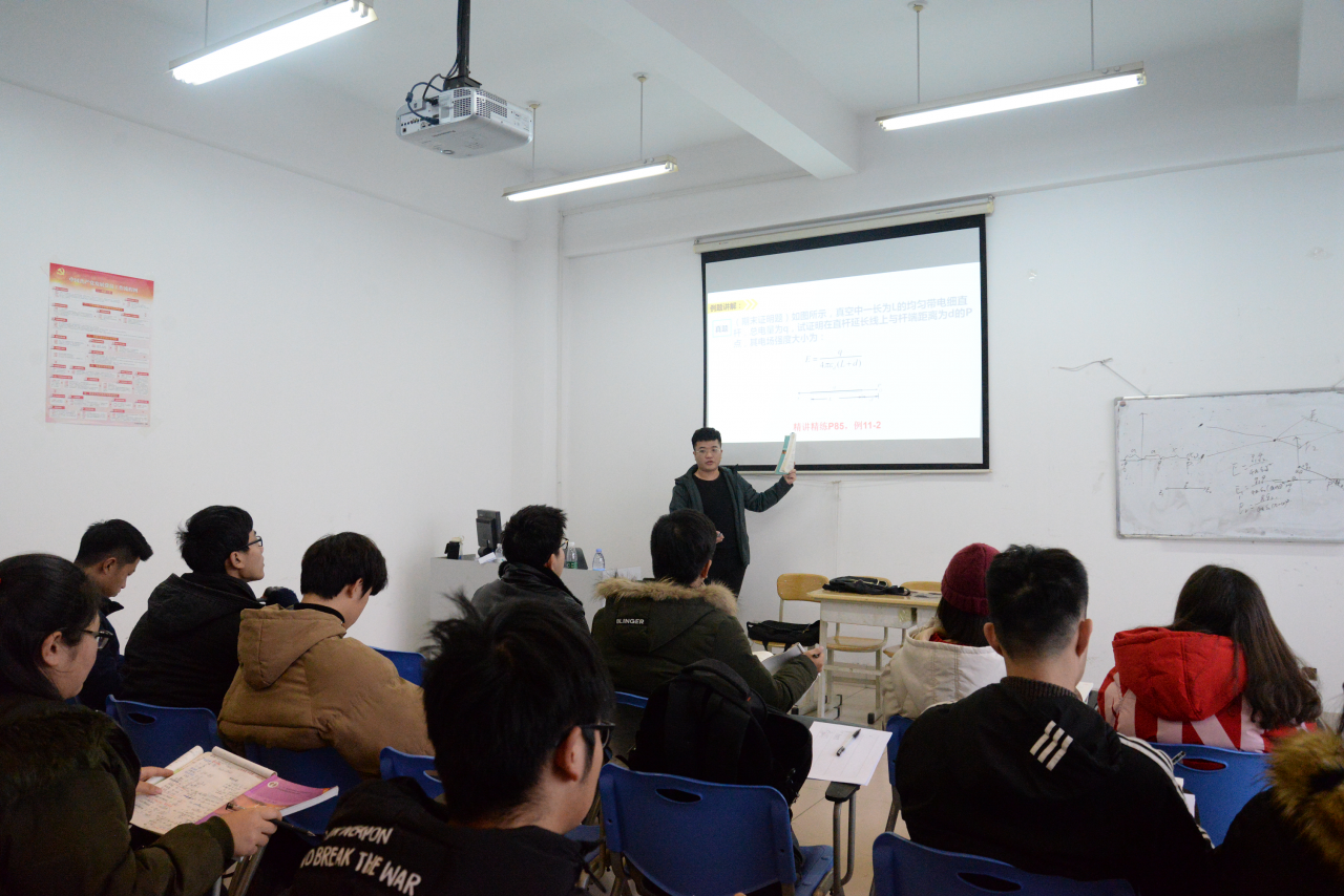 第二节课中,讲师团成员刘贤为同学们辅导了《大学物理》电学部分的内容。他从课本知识出发,结合典型例题和历年考题进行了讲解。同时他通过自身学习这门课程的经验,给同学们的复习思路提供了建议。