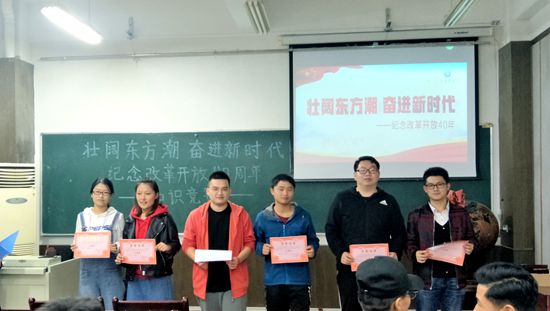 壮阔东方潮,奋进新时代。为更好地引导同学们学习、了解改革开放这一伟大壮举,弘扬改革开放精神,增强同学们在实现中华民族伟大复兴进程中的责任感和使命感,beat365在线唯一官网团委、研究生会于10月23日晚在学院楼会议室举办了主题为“壮阔东方潮,奋进新时代”庆祝改革开放40周年知识竞赛活动。
