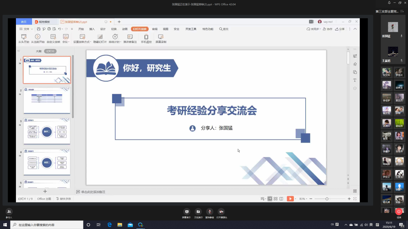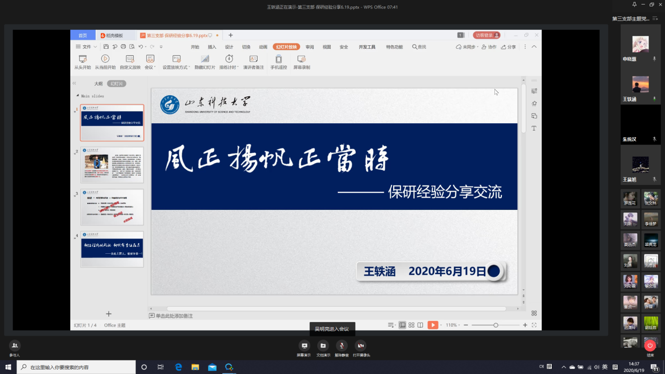 6月19日,beat365在线唯一官网本科生第三次党支部通过企业微信平台举办“榜样的力量”分享交流会。此次党日活动由党支部书记朱统汉主持,邀请了四名毕业生党员向低年级同学分享经验。