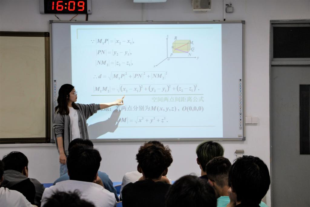 首先,兼职辅导员王继伟对“初心学堂”做了简要介绍,希望同学们通过“初心学堂”这个平台能够有所收获。随后,郑新重点讲解了空间解析几何和向量知识要点,通过深入浅出的讲解和练习相结合的形式,使同学们对此部分的知识点有了更加牢固的理解和掌握。同时她利用自身对这门课程的经验,给同学们复习该部分内容提供了建议。课堂上,同学们认真听讲,时而对难点进行思考,时而低头记录重点,课堂氛围良好。课程结束后,同学们纷纷表示收获颇丰,本次课程也取得良好的效果。