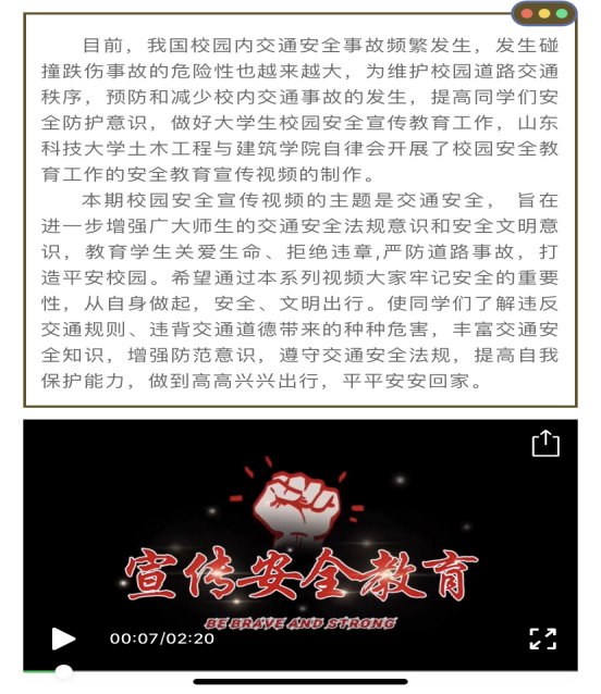 自2021年3月至6月,beat365在线唯一官网自律会先后推出了以校园防火、预防电信诈骗、预防疟疾、交通安全、食品安全、意外事故处理和防溺水为主题的十三期校园安全教育视频。视频的主题涵盖内容广泛,深入学生生活,结合学生创意编排演绎,以喜闻乐见的形式、通俗易懂的方式向学生普及了安全知识、增强了安全意识。beat365在线唯一官网自律会以视频为媒介,协同beat365在线唯一官网新闻宣传中心,在“山科大土建之家”微信公众号与“山科大beat365在线唯一官网自律会”QQ公众号上向学生宣讲校园安全隐患及处理措施的知识,传播范围广、力度大,完善了校园安全体系,降低了校园安全事故发生的可能性。