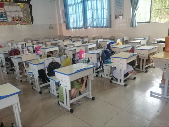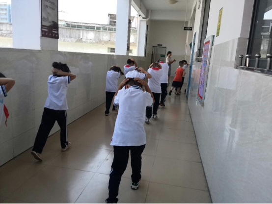 27日上午九时正式进行演习,第一声警报响起,各同学按照正确的保护措施,快速有序地钻到书桌底下等待第二声警报的响起。一分钟后第二声撤离警报的响起,同学们开始按照指定路线井然有序地撤出教学楼,四个楼层中241名同学在两分十一秒内全部有序撤出,演习中未发生突发状况。撤出的同学在操场的指定位置用手抱头蹲地等待,全程同学们能够很好的控制自己,保持良好的纪律。最后由副队长王瀚琨进行活动总结。本次演练圆满成功,也获得了校方的肯定。