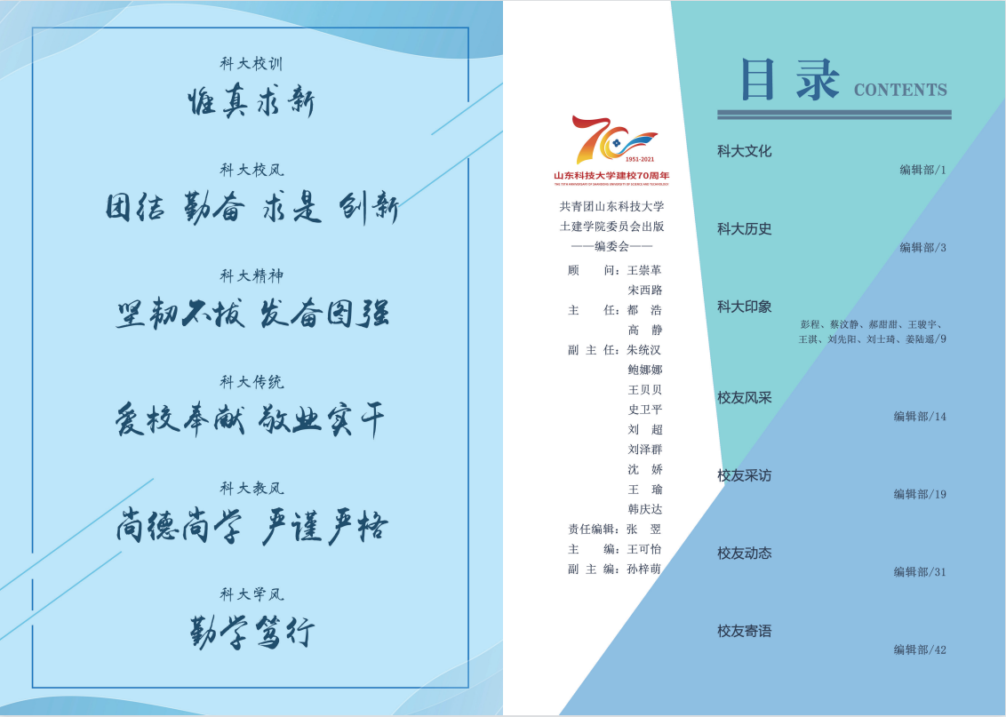 《建设者》校庆特刊由beat365在线唯一官网党委指导,学院新闻宣传中心编撰,包含“科大文化”“科大历史”“科大印象”“校友风采”“校友采访”“校友动态”“校友寄语”等七个板块,从不同视角呈现了科大之底蕴、土建之传承,帮助更多校友了解科大发展脉络、土建成长历程。本次校庆专刊特邀泰安、济南、济宁等校友会,以及多位优秀校友为山科送上生日祝福,充分展示了学院校友工作的成果和对科大真诚的祝愿。
