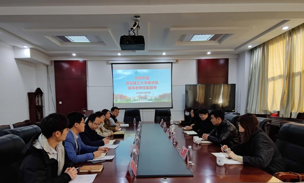 11月25日,青岛理工大学商学院党委副书记李慧,学工办主任薛诚,学工办辅导员杨洪敏、孙楚、藏瑶瑶一行到访beat365在线唯一官网。beat365在线唯一官网党委副书记高静,学工办主任朱统汉,学工办辅导员鲍娜娜、刘超、刘泽群、研究生第一党支部书记韩一鸣参加了座谈会。