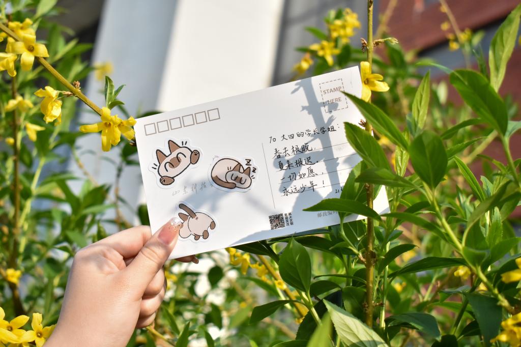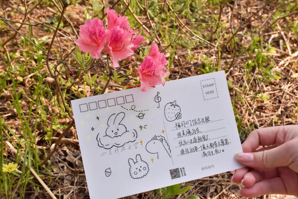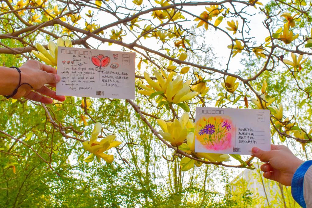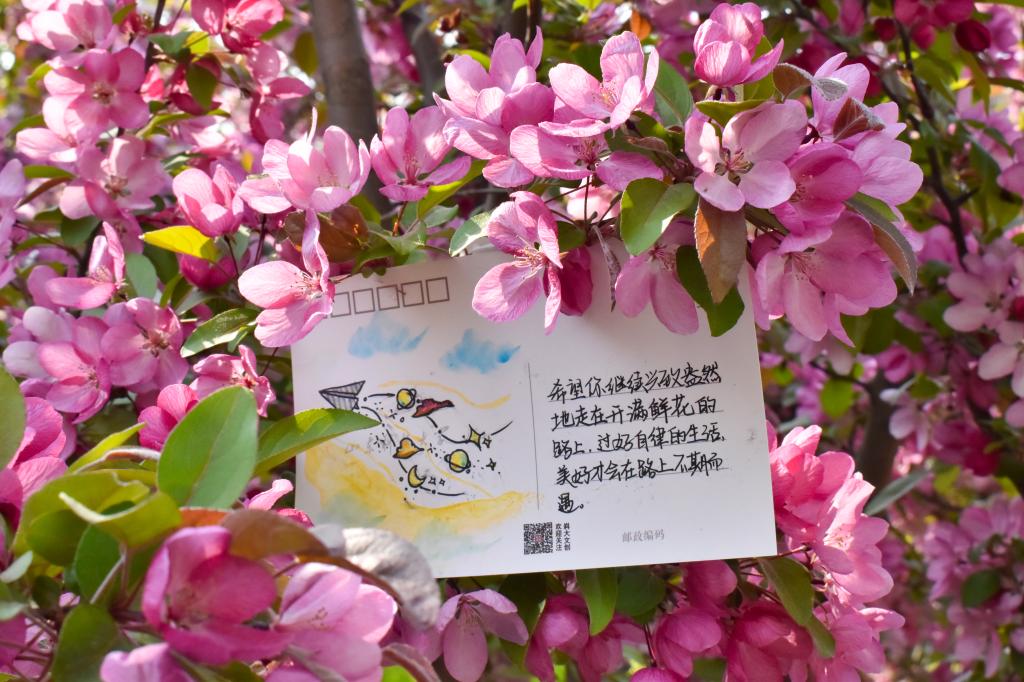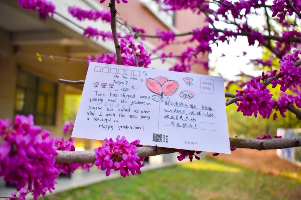 活动中,参与的学生寄情于笔,或书写出自己对毕业生深深的祝福,或描绘出一幅幅色彩斑斓的画作,用自己的真情实意填满整张明信片。随后,同学们将充满依依惜别之意的明信片放置在校园美景中,将祝福遍布整个校园。同学们漫步于墨水河畔,行走于若水园中;于励志坊边走过,在晨读园中徘徊。“挥挥手,作别青春的校园,留下灿烂的笑容,祝你万事胜意”“愿前程似锦,祝未来可期”……这些真挚的祝福语无不承载着同学们的心意。明信片悬挂于万紫千红之间,与满园美景一起,为毕业生送出真挚的祝福。