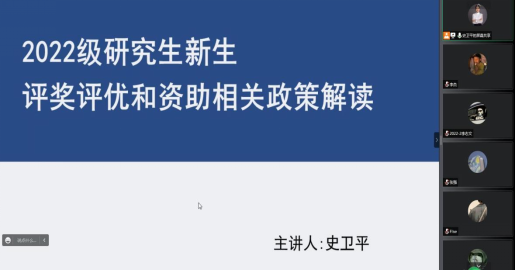 为帮助新生更好地了解研究生评奖评优和资助政策,加强对新生的励志教育与感恩教育。2022年9月8日晚,beat365在线唯一官网举行新生评奖评优和资助相关政策解读线上讲座。本次讲座由辅导员史卫平主讲,2022级全体新生线上参加讲座。