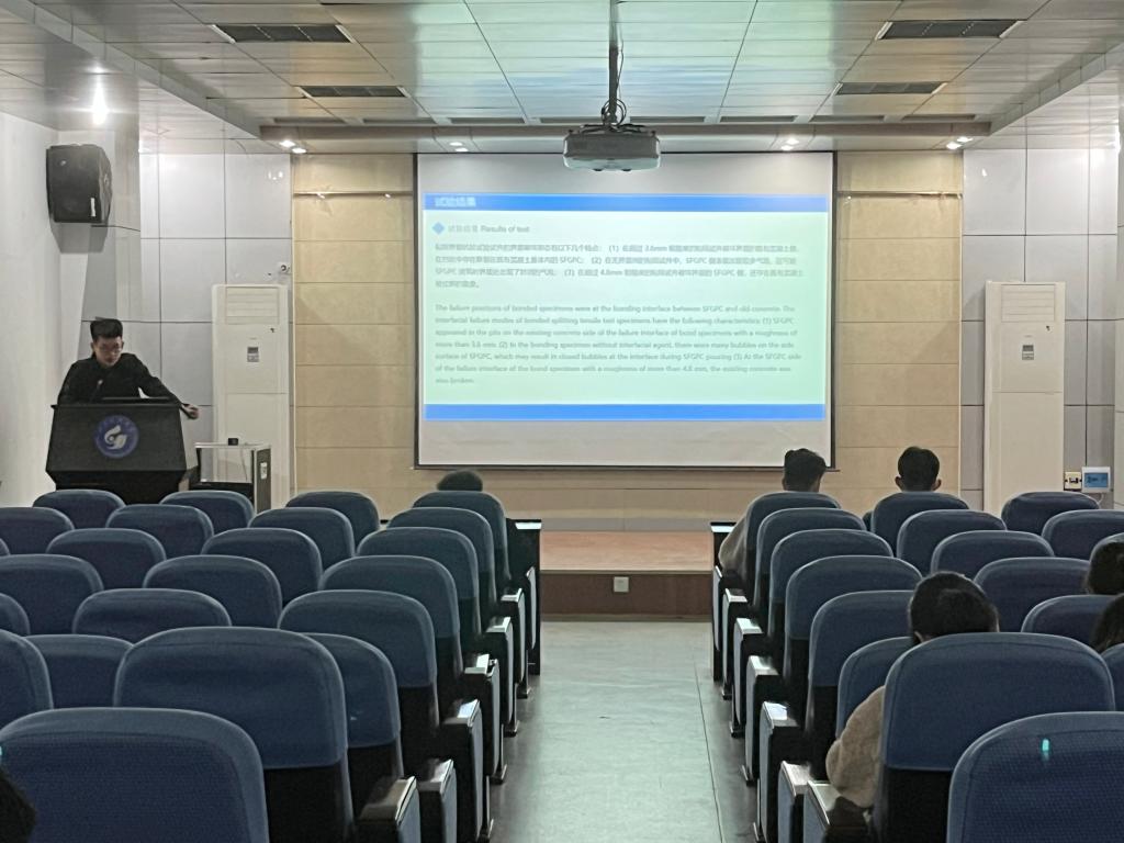 本次讲坛主要介绍了新老混凝土材料、腐蚀环境对新老混凝土界面粘结性能的影响以及各因素对界面粘结强度的影响规律。郑骐从混凝土构件容易在腐蚀环境中受到粘结破坏出发,仔细阐述了SFGPC较水泥基材料更适合作为腐蚀环境下修复混凝土结构的材料,让同学们更加直观认识到混凝土修补研究中存在的问题。随后,郑骐展示了目前常见的新老混凝土材料,通过讲解新老混凝土在酸、盐两种腐蚀介质下的表观现象以及新老混凝土在劈裂抗拉强度试验中试件破坏现象,阐明了新老混凝土、腐蚀环境对界面粘结性能的影响规律。此次讲座让同学们受益匪浅,同学们不仅学习到了混凝土修补的有关内容,同时激发了同学们对学术科研的热情。
