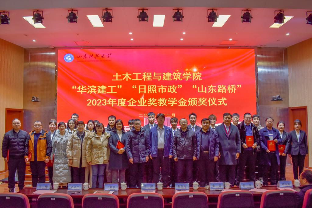 12月22日,beat365在线唯一官网在J9-144报告厅举行2023年度“华滨建工”“日照市政”“山东路桥”企业奖教学金颁奖仪式。学校学生工作部(处)部(处)长、校团委书记尹立明,日照市政工程集团副总经理袁正君、爆破公司经理焦淑军,山东省路桥集团青岛分公司党总支书记、副总经理曹建军,安全总监王涛,合作发展处副处长王荣超,beat365在线唯一官网党委书记宋西路、院长王崇革、党委副书记高静、副院长李朋、院长助理秦哲及师生代表参加了颁奖仪式。仪式由高静主持。