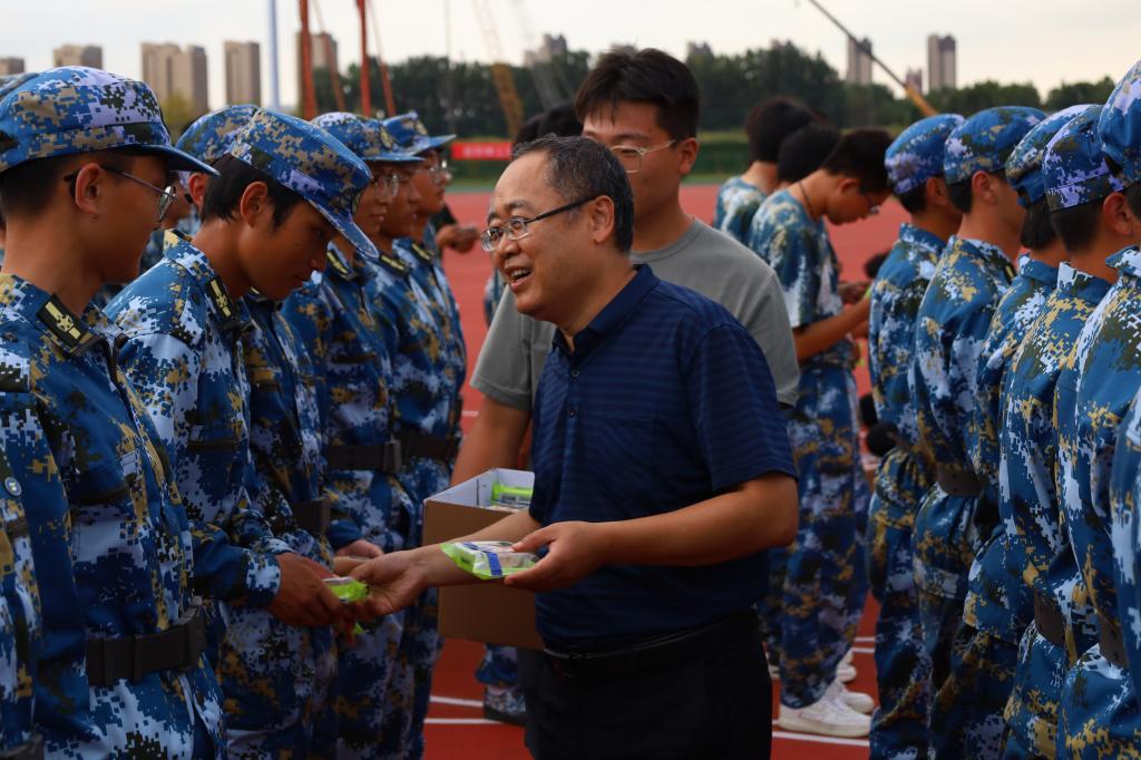 随后,现场领导们向全体参训新生送上了中秋月饼。月饼不仅象征着中秋节的团圆,也寄托了学院对新生们的关怀与祝福。现场气氛热烈,一位新生激动地说:“在军训的疲惫中能收到学校和学院领导送来的月饼,让我们感受到了家一般的温暖,这让我们更有动力和信心完成接下来的军训任务。”
