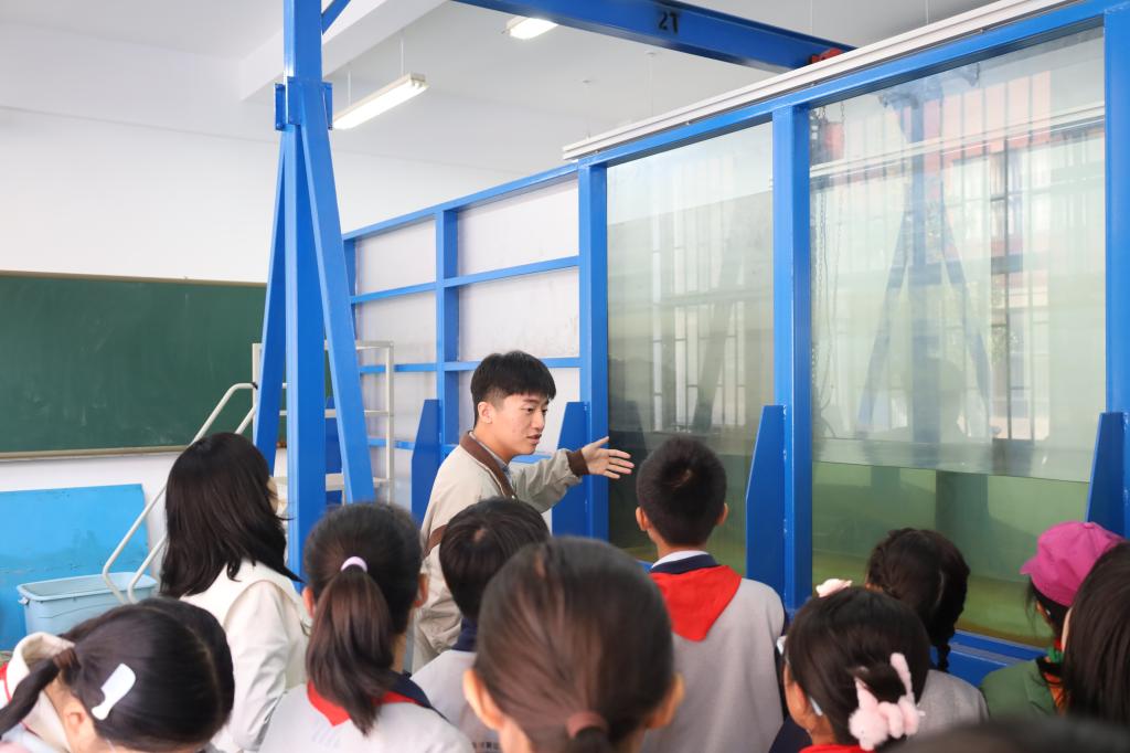 志愿者带领学生们参观了海洋土木实验室与结构大厅实验室,实验室的工作人员展示了模拟海浪波动实验和混凝土3D打印。学生们得以近距离观察波浪的形成和混凝土3D打印的基本流程,也让他们对土木工程有了更加生动和直观的认识,激发了他们对工程设计和创新思维的热情。