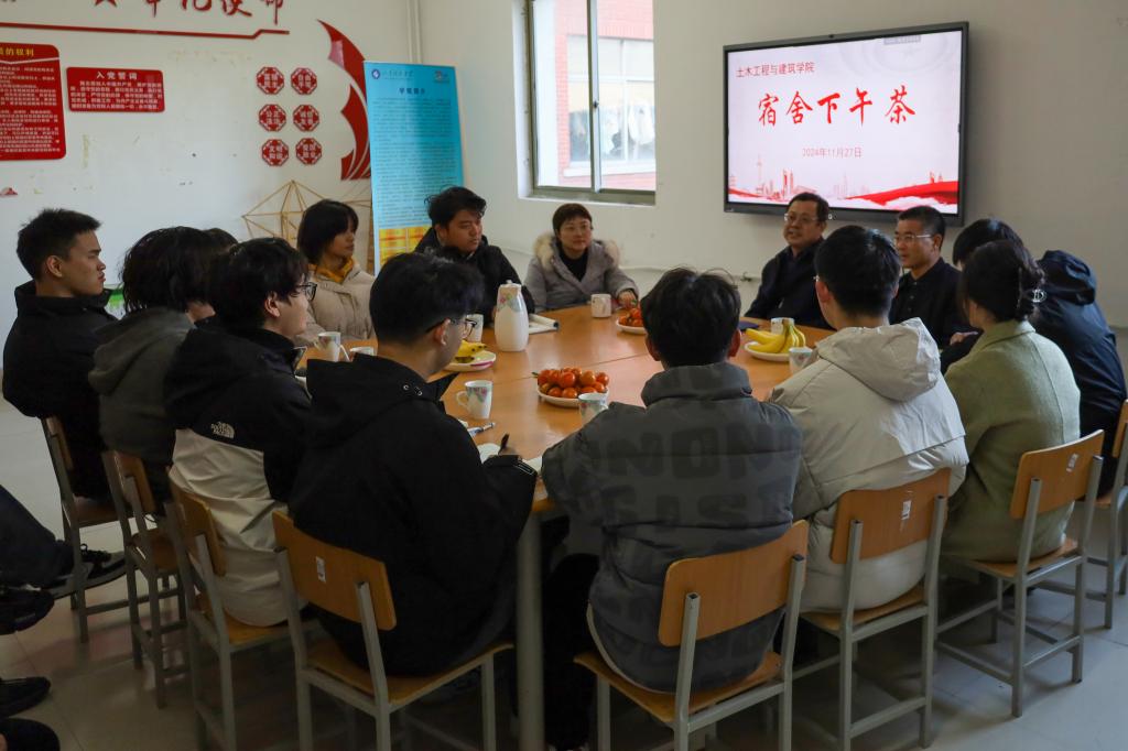 11月27日下午,校党委统战部常务副部长王永君做客beat365在线唯一官网“宿舍下午茶”,与所联系班级土木工程2022-1班的同学们开展了一场亲切且深入的座谈交流活动。学院党委书记宋西路,党委副书记、副院长高静,学工办主任、团委书记王贝贝,辅导员老师李宏宇陪同参加。