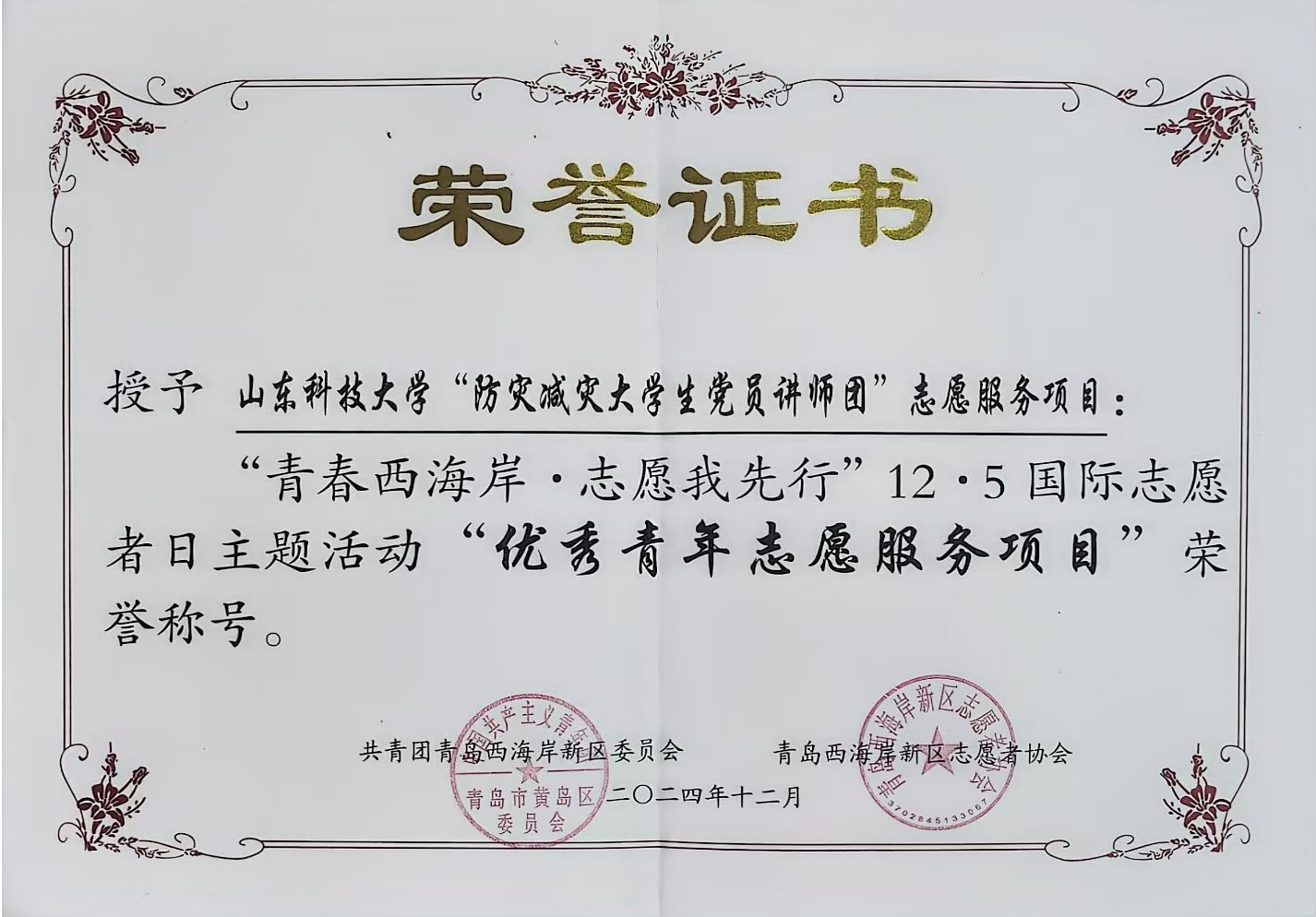 12月4日,在第39个国际志愿者日到来之际,西海岸新区团委举办“青春西海岸·志愿我先行”12·5国际志愿者日主题活动,表彰优秀青年志愿者、优秀青年志愿服务项目、优秀青年志愿服务工作者获奖代表以及驻区高校优秀青年大学生代表。beat365在线唯一官网防灾减灾大学生党员讲师团获“优秀青年志愿服务项目”荣誉称号,并作为唯一项目代表进行汇报展演。