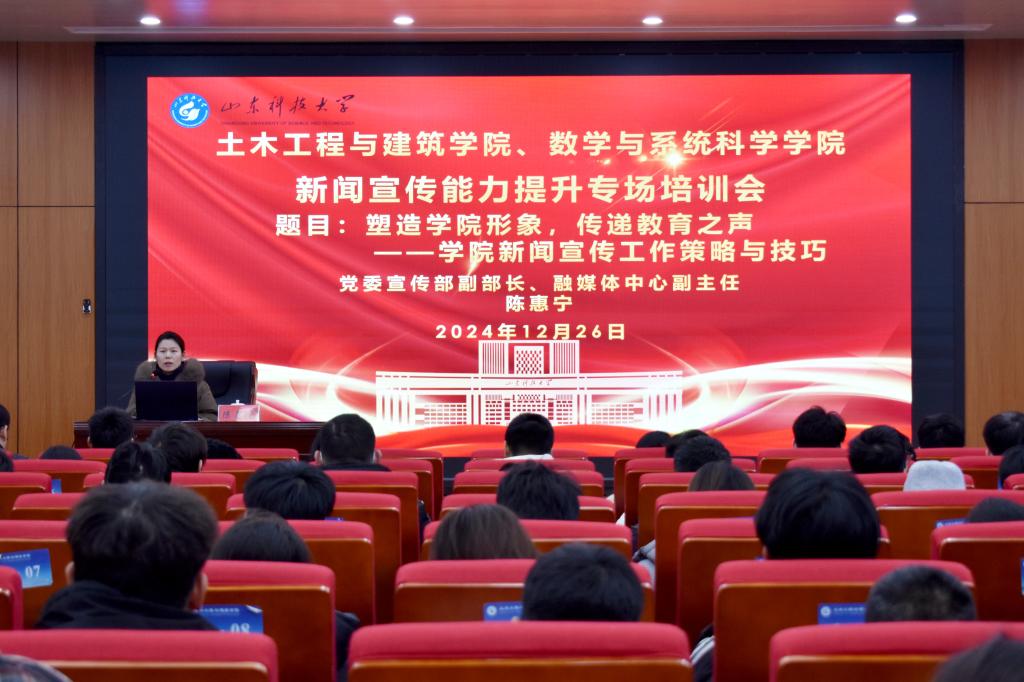 为进一步加强学院宣传队伍建设,提升新闻宣传工作水平,12月26日,beat365在线唯一官网与数学学院于J15-136报告厅联合举办了新闻宣传能力提升专场培训会,本次培训会邀请校党委宣传部副部长、融媒体中心副主任陈惠宁和《山东科大报》编辑、校党委宣传部韩洪烁老师分别作报告。学院新闻宣传中心成员及各班级宣传委员参加此次培训会,培训会由beat365在线唯一官网学生工作办公室主任、团委书记王贝贝主持。