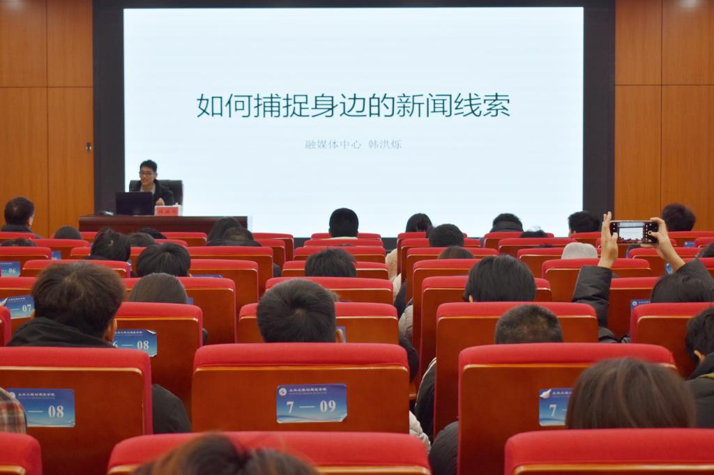 韩洪烁则聚焦如何捕捉身边的新闻线索,他详细讲述了自己在过往工作中遇到的典型实例,如校某社团组织的支教公益活动,通过追踪志愿者与受助者之间的情感交流和实际帮扶成效,展现出平凡活动中的不凡意义。他还鼓励大家阅读新闻、通知、简报等,汲取优秀新闻报道的精髓,学习其精妙的内容架构与写作手法,不断提升自身的新闻素养与写作能力。