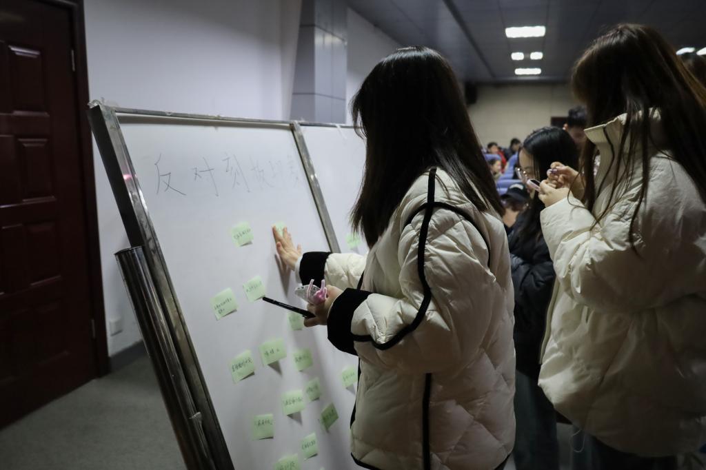 活动现场,同学们创意十足,运用五彩扭扭棒精心制作花束,将传统绒花工艺与现代设计结合,创作出兼具艺术性与实用性的手工艺品;学生自由选取彩泥,通过揉捏、塑形、上色等步骤,将一块块普通的粘土变成了栩栩如生的花卉、美味可口的蛋糕模型等作品,以此表达祝福与敬意。同时,在展板区域,大家踊跃上前,在便利贴上写下自己对于性别平等的理解、对女性力量的赞美以及对消除性别刻板印象的倡议,随后将其贴在展板上,覆盖带有女性刻板印象或偏见的标签。这一看似微小的举动,却具有深远意义,它象征着打破固有观念,鼓励大家从内心深处接纳和认可女性在各个领域所展现出的无限潜力。
