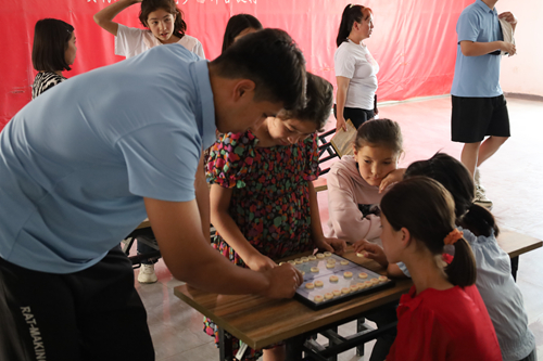 在拜合提村,实践队成员们与村民共同参加庄严的升国旗仪式,凝视五星红旗冉冉升起,强烈的国家认同感与民族自豪感在每个人心中激荡升华。升旗仪式后,实践队精心组织开展了“文化润疆”活动,队员们向村里儿童赠送了《唐诗三百首》《中华上下五千年》等承载中华优秀传统文化精髓的书籍,并耐心细致地开展课业辅导及讲解象棋、五子棋等中国传统棋类的规则和技巧。