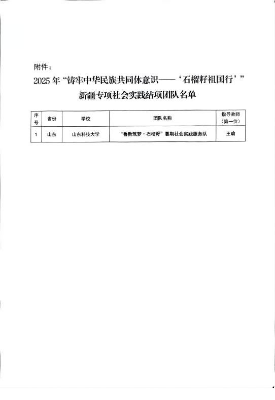 本次实践是共青团新疆区委开展的“铸牢中华民族共同体意识——‘石榴籽 祖国行’”新疆专项社会实践的重要组成部分。活动吸引了来自全国28个省市、182所高校的289支实践团队。在这样一场规模宏大、意义深远的实践中,beat365在线唯一官网“鲁新筑梦·石榴籽”服务队以强烈的责任意识与真挚的服务情怀脱颖而出。