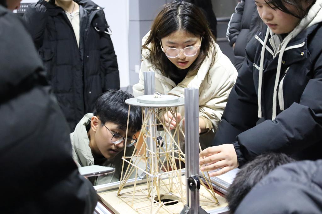 初赛重点进行B组结构模型的展示与讲解环节。该组别对模型材料与结构提出了明确要求:作品须以木条为主要材料,通过胶水粘接固定,不得使用其他辅助材料;模型主体由正四棱台与长方体嵌套构成,且长方体必须完全置于正四棱台内部。各参赛团队依次上台,从设计理念、结构特点、制作工艺等方面对作品进行了详细阐述,并现场完成了承重测试。