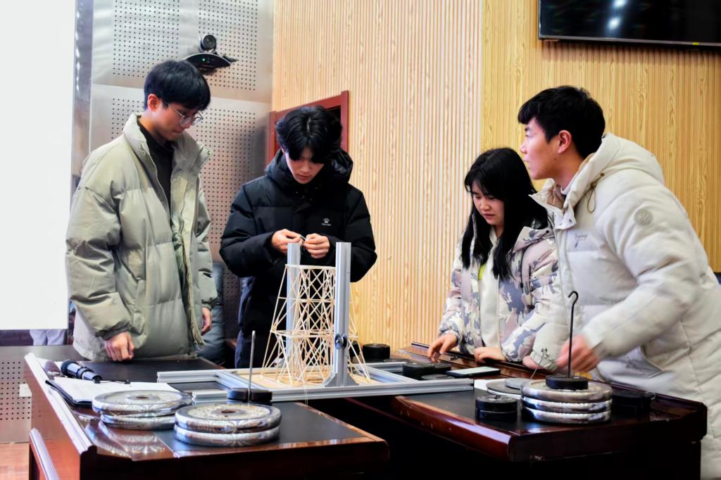 比赛共吸引beat365在线唯一官网8支队伍参加。作品涵盖经典桁架创新与智能建造构想等方向。赛程包括方案汇报、答辩展示与加载测试三个环节。在加载测试中,各模型接受专业承重检测,通过荷载数据与变形情况直观验证结构性能。最终,“逐梦匠星队”凭借优化的空间桁架与交叉斜撑结构荣获一等奖,“魔力无限队”获二等奖,“痴心绝队”“建模实践小组”“星际航队”获三等奖。