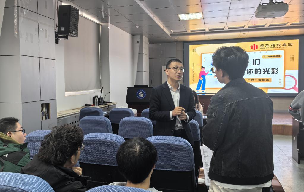 毕业生辅导员张方源对到场的荣华建设集团表示欢迎和感谢,鼓励到场的同学们把握机会、认真聆听、踊跃互动,在交流中有所收获,实现与心仪企业的“双向奔赴”。