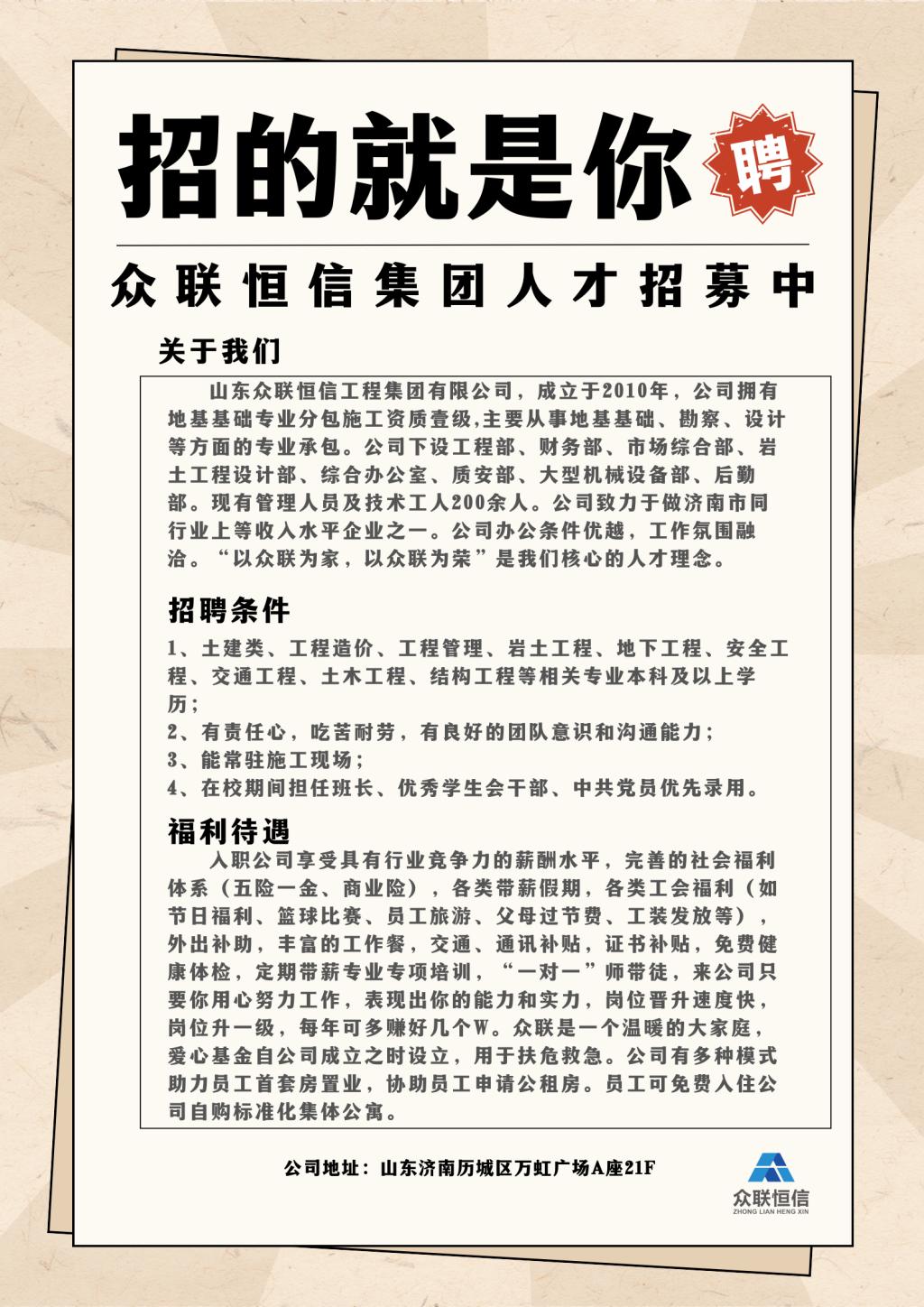 招聘信息(042)山东众联恒信工程集团有限公司