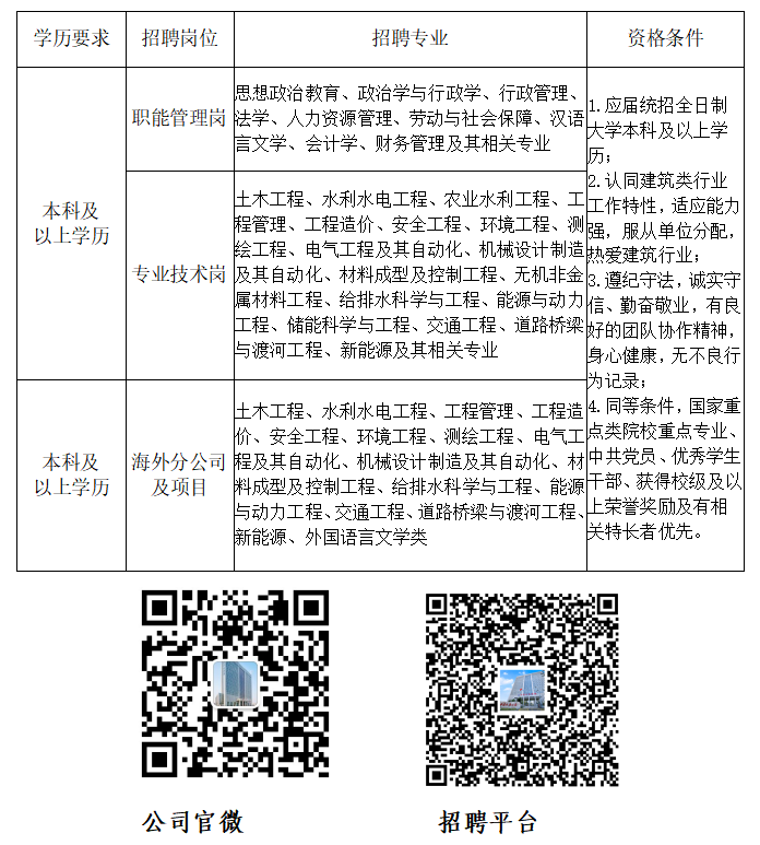 7.工作地点:公司业务遍布国内外,入职后公司根据人力资源发展规划及项目建设履约需要,同时紧密结合个人意愿分配工作区域和项目。