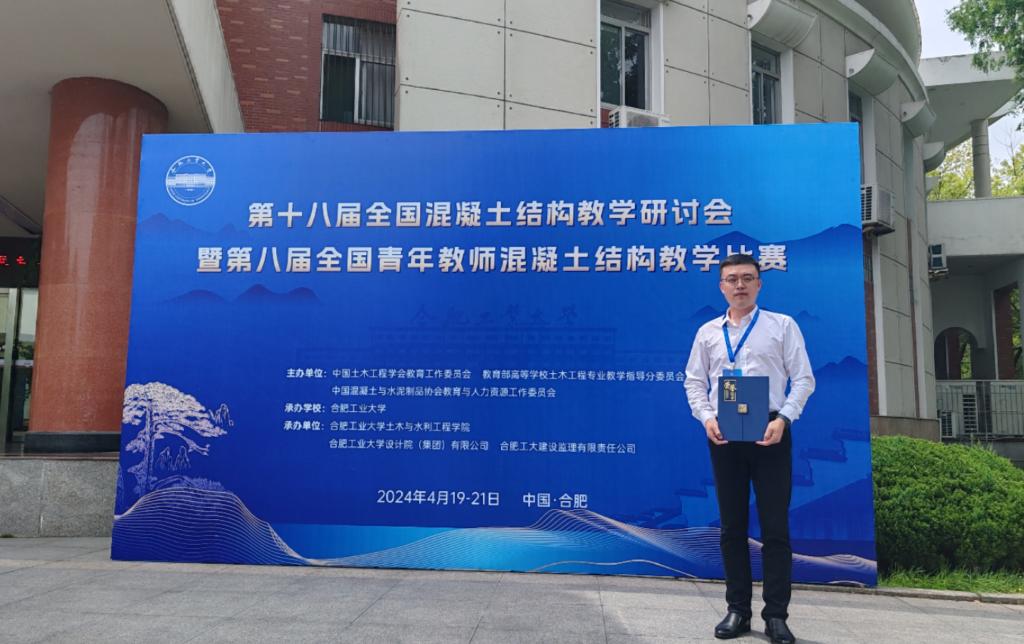 4月20-21日,由中国土木工程学会教育工作委员会、教育部高等学校土木工程专业教学指导分委员会、中国混凝土与水泥制品协会教育与人力资源工作委员会主办,合肥工业大学土木与水利工程学院等承办的第十八届全国混凝土结构教学研讨会暨第八届全国青年教师混凝土结构教学比赛在合肥举办。建筑工程系教师王飞参加比赛,并荣获一等奖。