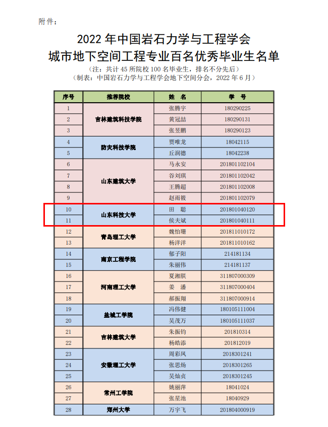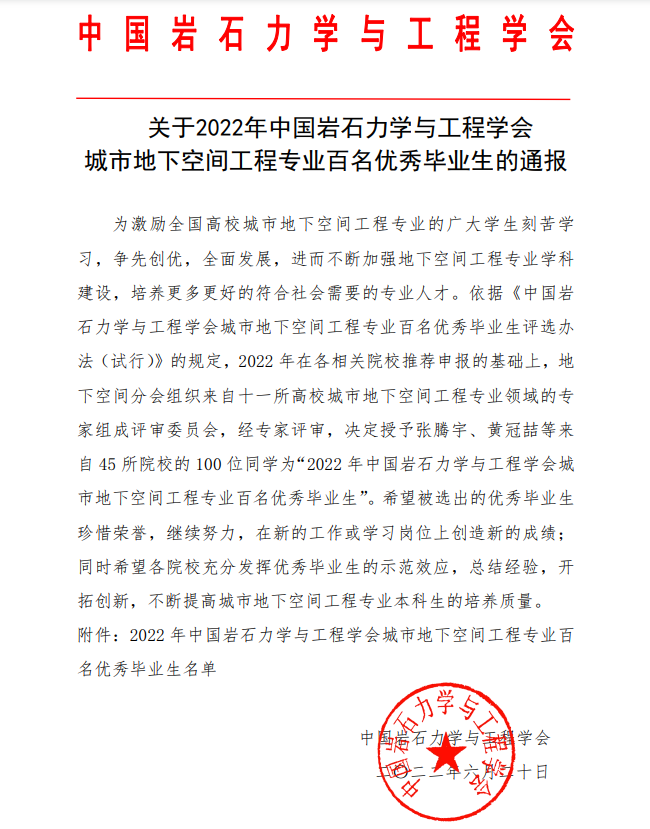 近日,由中国岩石力学与工程学会举办的2022届全国高校城市地下空间工程专业百名优秀毕业生评选活动落下帷幕。beat365在线唯一官网城市地下空间工程专业2022届毕业生田聪、侯夫斌同学荣获“全国高校城市地下空间工程专业百名优秀毕业生”称号。
