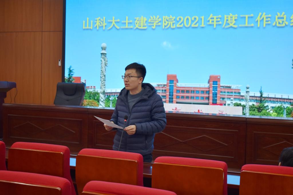 会上,王崇革全面回顾了学院在党建与思想政治、本科教学与专业建设、学科建设与研究生培养、科学研究与实验室建设、师资队伍建设、社会服务与校友工作、学团工作等方面所取得的突出成绩,总体上实现了“十四五”开好局、起好步的预期目标;向全体教职工公布了2021年度学院各项经费分配使用情况;并对年度考核、聘期考核进行了政策解读,向全体教职工传达了学校2021年绩效工资分配会议精神及学院2021年绩效工资实施办法。