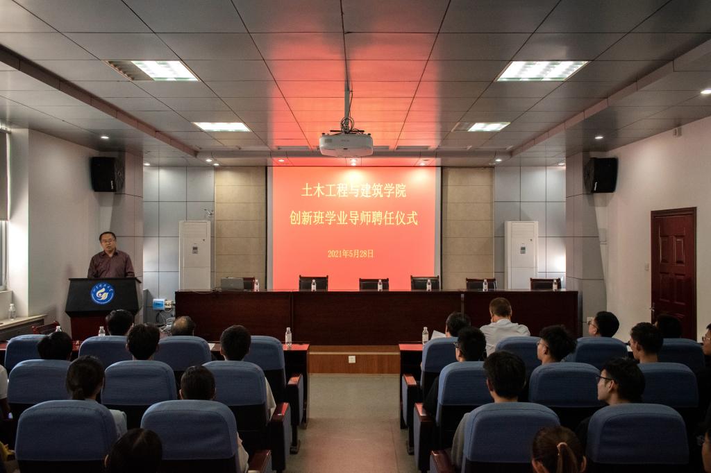仪式开始,院长王崇革向全体参会导师和学生介绍了实验创新班的基本情况。他指出,实验创新班是为培养厚基础、宽口径、强能力、重创新的高水平拔尖人才而建设的实验创新试点项目,是学院全面贯彻党的教育方针,坚持立德树人根本任务的一项重要举措。同时,王院长向全体学生提出四点要求:一要志存高远,胸怀大志;二要勤奋学习,热爱专业;三要德智体美劳全面发展;四要时刻准备好迎接挑战。